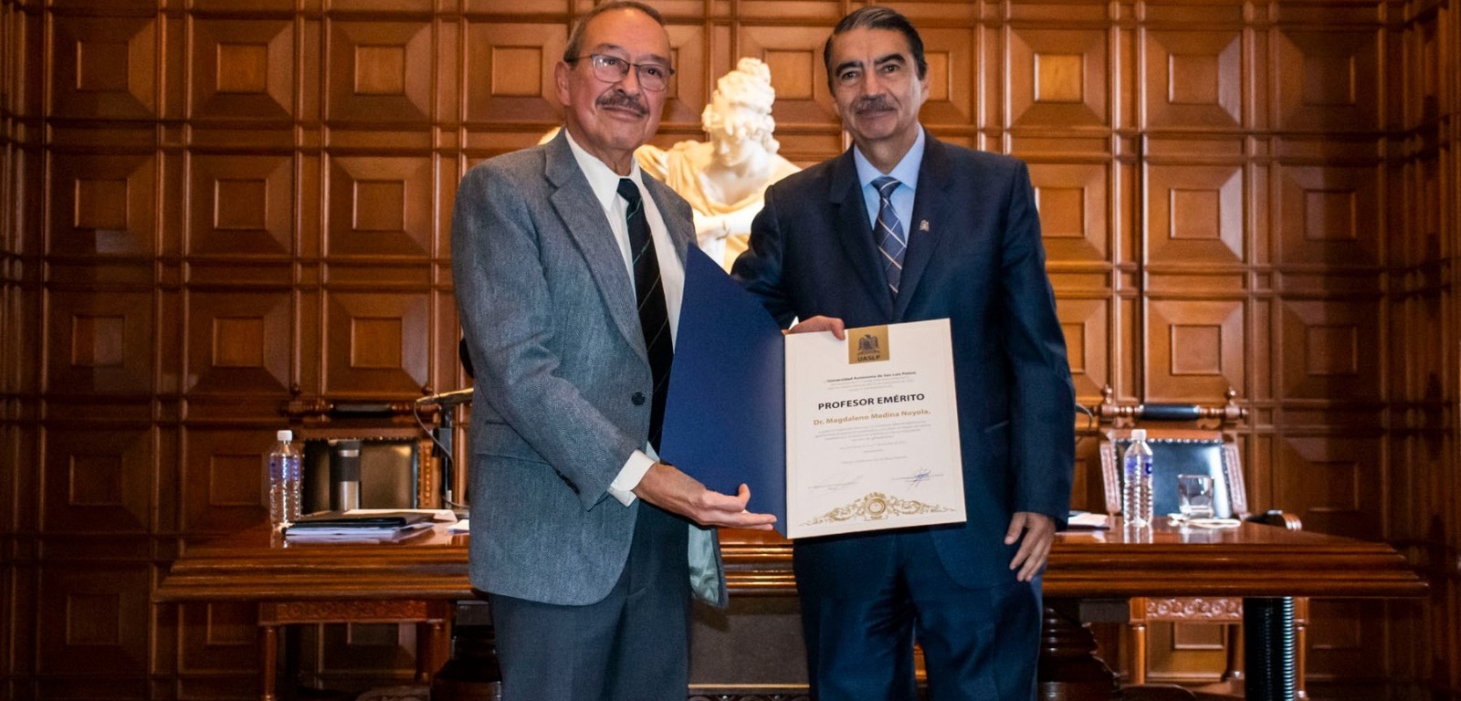 Por su parte, el doctor Magdaleno Medina Noyola agradeció el reconocimiento recibido por su Alma Mater, “la Universidad Autónoma de San Luis Potosí somos todos, y me quedo muy complacido con este reconocimiento”.