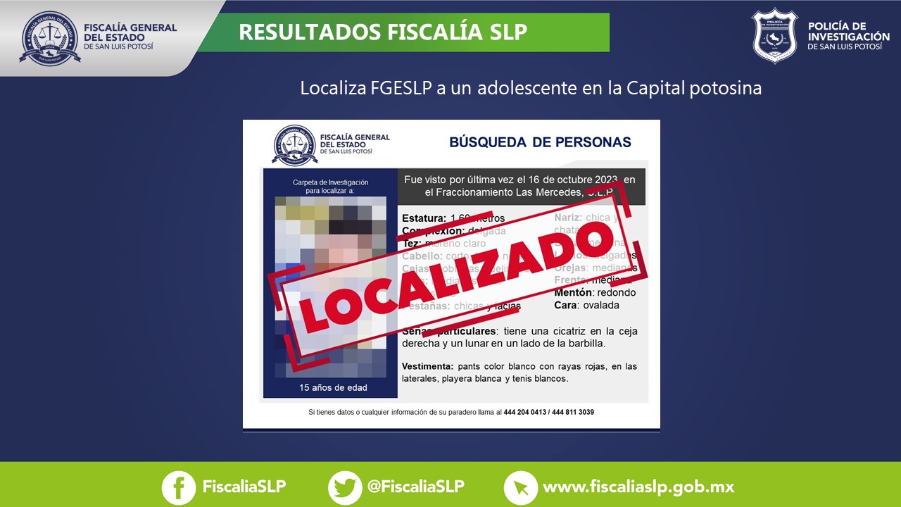 La Fiscalía General del Estado de San Luis Potosí (FGESLP) mediante acciones de la Policía de Investigación (PDI) adscrita a la Delegación Primera, logró ubicar a Josías, un adolescente de 15 años de edad, que era buscado en la región centro del territorio.