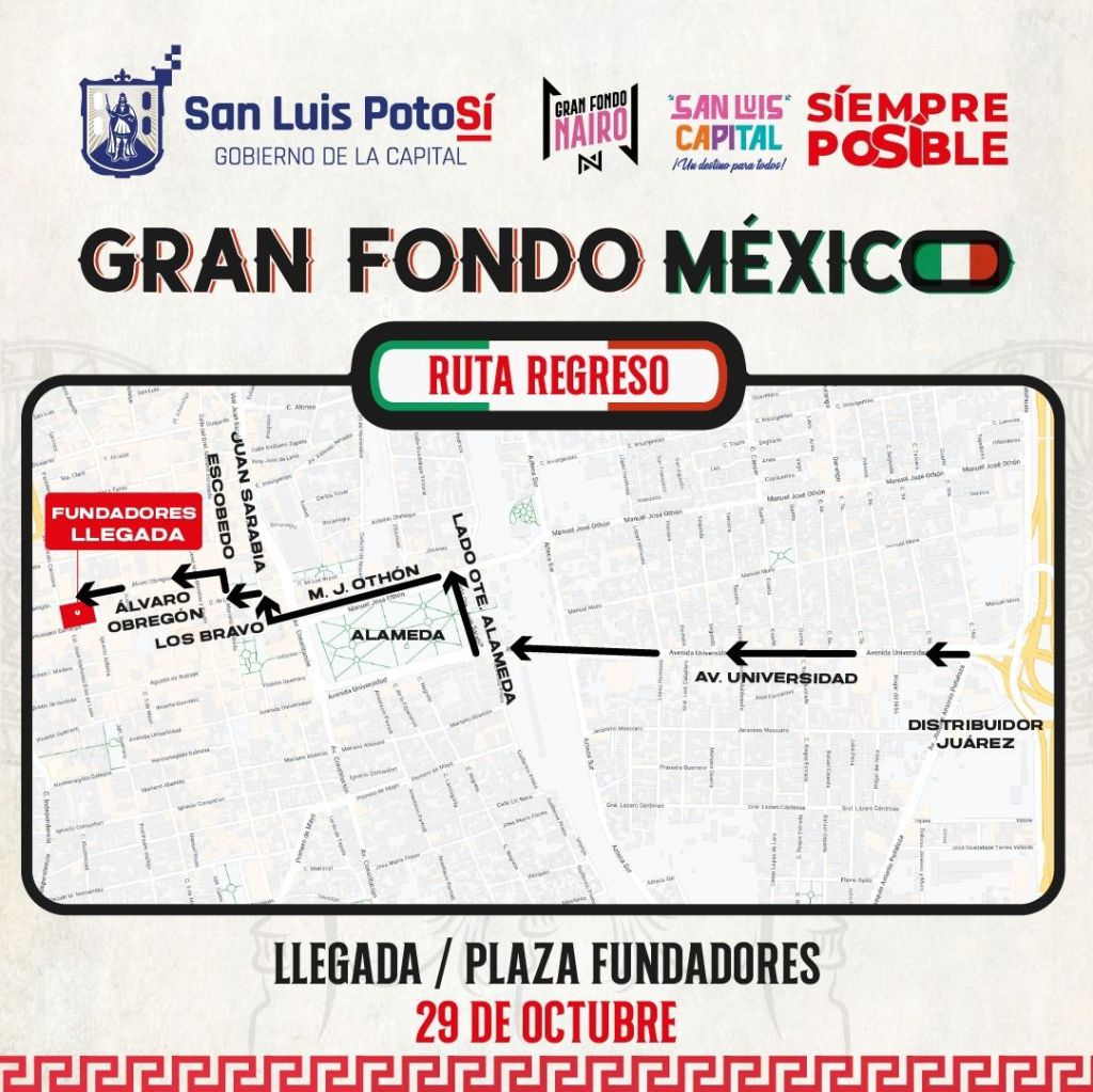 En el plan de operaciones para este evento, la SSPC de la Capital estará coadyuvando con las policías locales, principalmente en los puntos de retorno de cada etapa, para los retadores (50 km) la zona de retorno estará ubicada a unos metros de Ciudad Satélite. En Armadillo de los Infante, será el retorno del Medio Fondo, en tanto el Gran Fondo continuará hacia San Nicolás Tolentino, Villa Hidalgo y Armadillo para retornar a la Capital potosina por la Carretera Rioverde – San Luis Potosí.