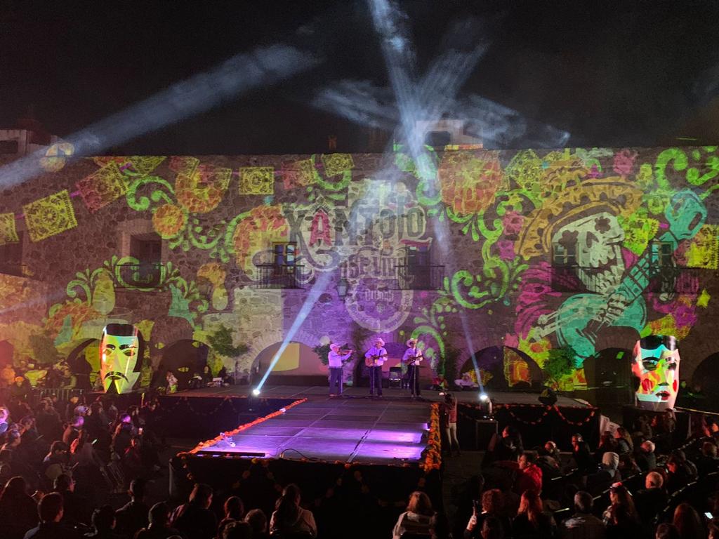 Las personas que se concentraron en esta gran plaza disfrutaron de un espectáculo de luz en las paredes que sirvieron de escenario para este gran evento, en el que se mostraron imágenes representativas de las festividades en torno al Día de Muertos, Xantolo o Sanctorum de la Huasteca.