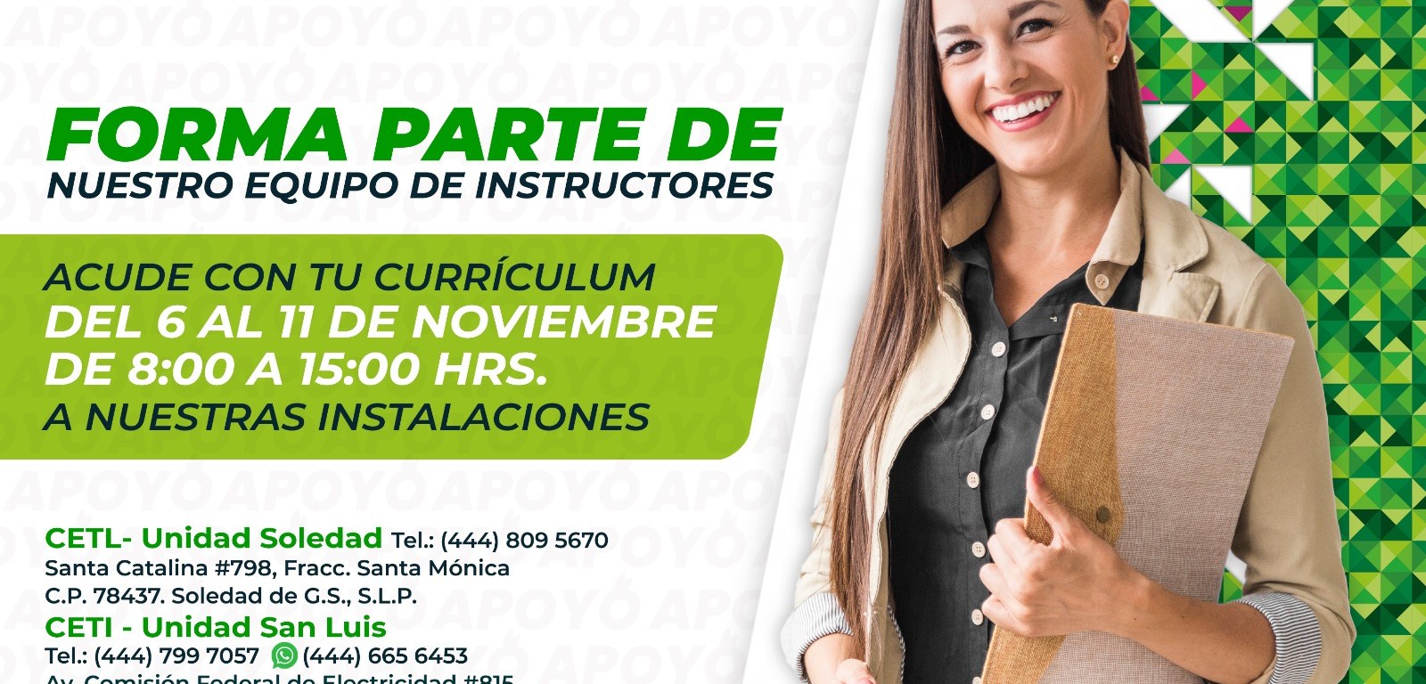 Las y los interesados podrán acudir con currículum al Centro de Entrenamiento Técnico en Logística, en la calle Santa Catalina 798, colonia Santa Mónica en Soledad de Graciano Sánchez, o en el Centro de Entrenamiento Técnico Industrial, en avenida Comisión Federal de Electricidad 815, casi esquina con Eje 136 en la zona industrial, en un horario de 08:00 a 15:00 horas.
