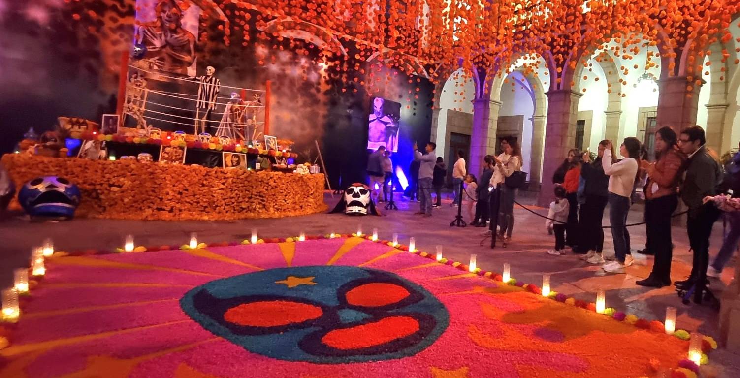 Este lunes, miles de visitantes locales, nacionales y extranjeros acudieron al Palacio de Gobierno para admirar el altar de muertos dedicada a ídolos de la lucha libre mexicana que han fallecido, dejando un legado en el pancracio.