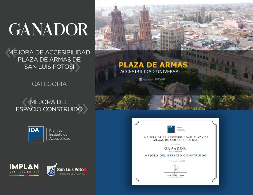 En la primera edición de los Premios del Instituto de Accesibilidad (IDA) 2023, el Instituto Municipal de Planeación (Implan), fue distinguido con el primer sitio, gracias al proyecto “Mejora de la Accesibilidad Plaza de Armas San Luis Potosí”, en la categoría “Mejora de un Espacio Construido”, entre más de 60 proyectos internacionales que participaron en estos reconocimiento del Instituto de Accesibilidad (IDA), institución española especializada y enfocada en la accesibilidad en América Latina.