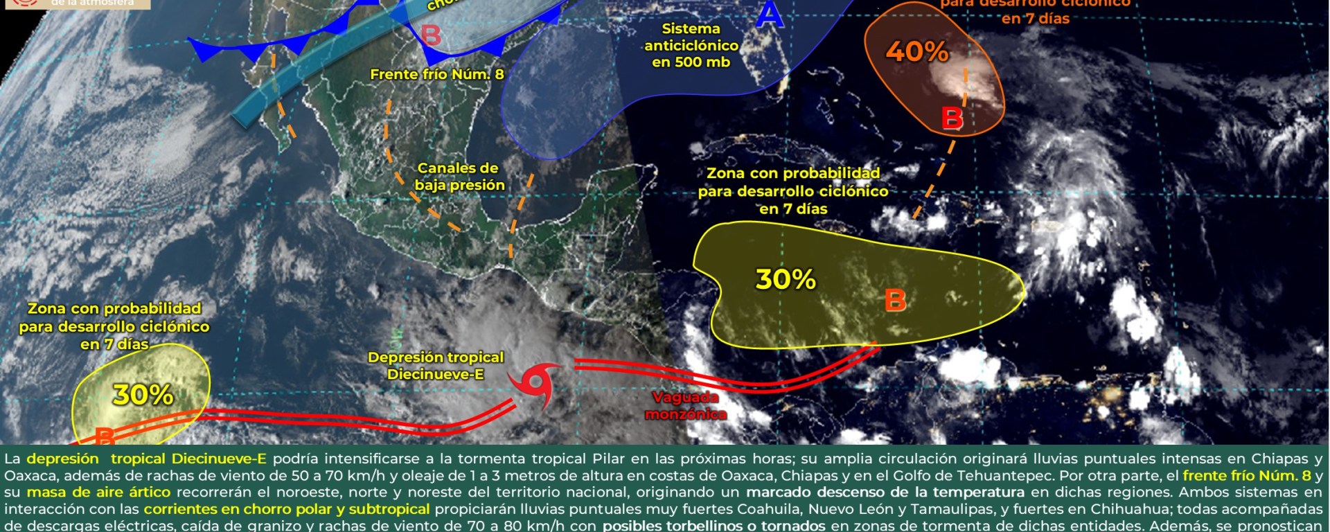 Evento de “Norte” con rachas de 100 a 120 km/h, oleaje de 3 a 5 metros y posible formación de trombas marinas: costas de Tamaulipas y Veracruz, Istmo y Golfo de Tehuantepec; y con rachas de 50 a 70 km/h y oleaje de 1 a 2 metros de altura: Tabasco y Campeche.