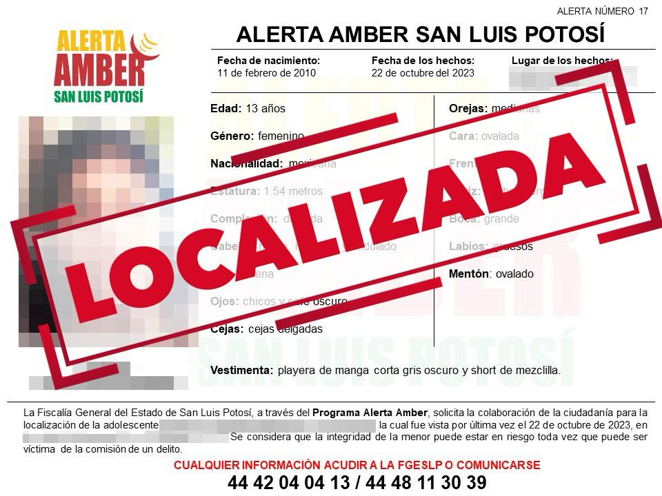 Este martes 31 de octubre de 2023, una adolescente que contaba con ficha de Alerta Amber en la Zona Media fue localizada, así lo dio a conocer la Fiscalía General del Estado de San Luis Potosí (FGESLP).