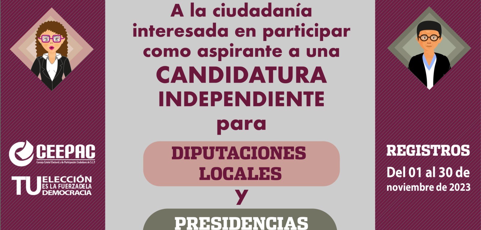 El Consejo General del Consejo Estatal Electoral y de Participación Ciudadana (CEEPAC) la Convocatoria para que la ciudadanía con interés en postularse mediante Candidaturas Independientes para los cargos de diputaciones y presidencias municipales que se renovarán en el proceso electoral 2024 en San Luis Potosí.