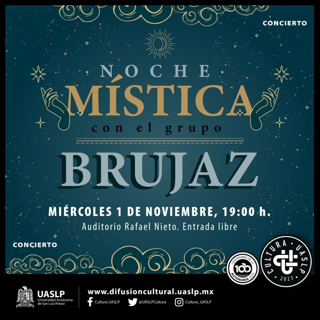 El miércoles 01 de noviembre de 2023 en punto de las 19:00 horas en el Auditorio Rafael Nieto, se llevará a cabo el concierto “Noche Mística”, a cargo de la agrupación potosina “Brujaz”. Brujaz, es un grupo de Rock-Fusión que entre misticismo y metáforas intentan ofrecer algo nuevo al oído, sin olvidar las raíces de nuestros ancestros. La entrada es totalmente libre.