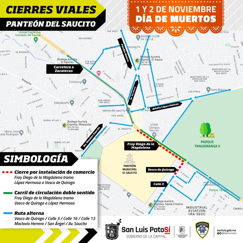 Como cada año, frente al panteón El Saucito, sobre la avenida Fray Diego de la Magdalena se habilitará la zona de rodamiento del lado nor-oriente de la misma vía (carriles de sur a norte) en el tramo de Vasco de Quiroga a la calle J. López Hermosa en doble sentido de circulación.