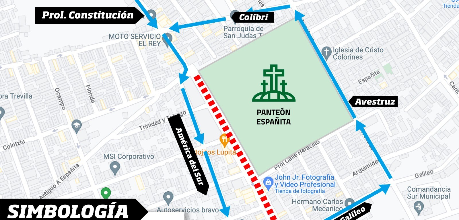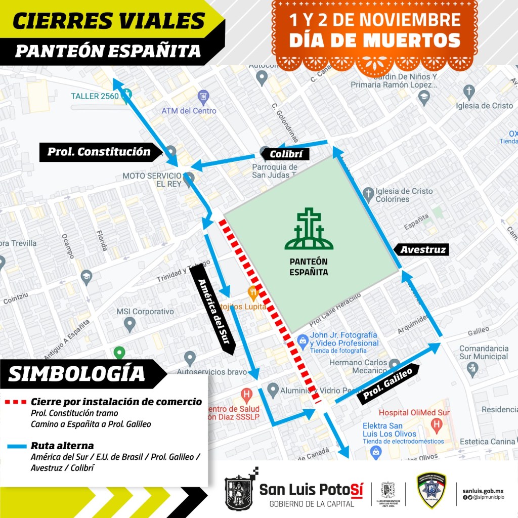 En la zona del panteón Españita se habilitará cierre vial por instalación de comercio semi-fijo en prolongación Constitución en el tramo de las calles Camino Antiguo a Españita a Estados Unidos de Brasil, esto en ambos sentidos. Se habilitarán como rutas alternas las calles de Camino Antiguo a Españita, América del Sur y Estados Unidos de Brasil, así como prolongación Galileo, Avestruz y Colibrí.