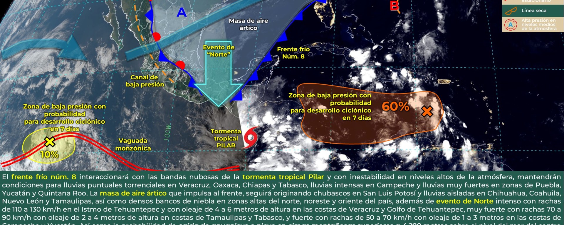 Evento de “Norte” con rachas de 100 a 120 km/h: Istmo de Tehuantepec, y con oleaje de 4 a 6 metros y posible formación de trombas marinas: costas de Veracruz y Golfo de Tehuantepec.