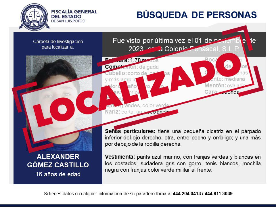La Fiscalía General del Estado de San Luis Potosí (FGESLP) informa la localización de un adolescente de 16 años de edad, quien era buscado en la ciudad capital.