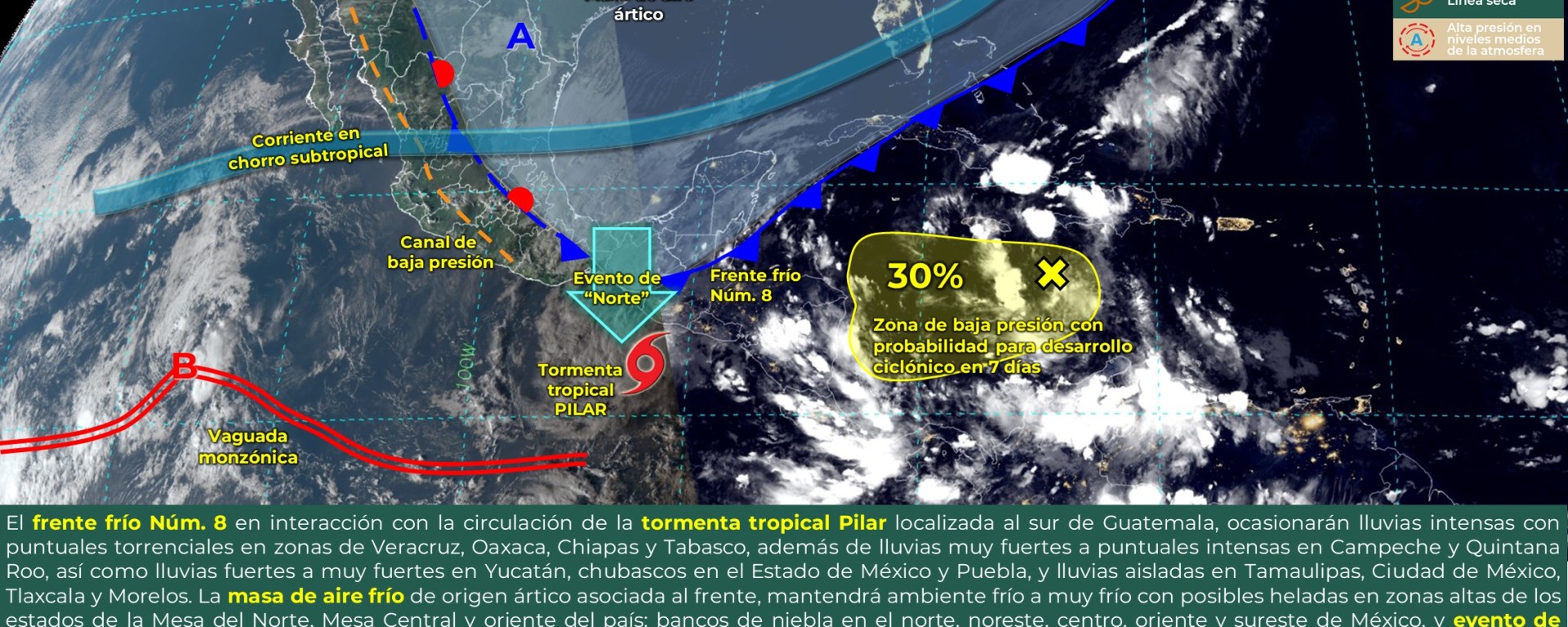 Evento de “Norte” con rachas de 80 a 100 km/h: Istmo de Tehuantepec, y con oleaje de 2 a 4 metros: Golfo de Tehuantepec.