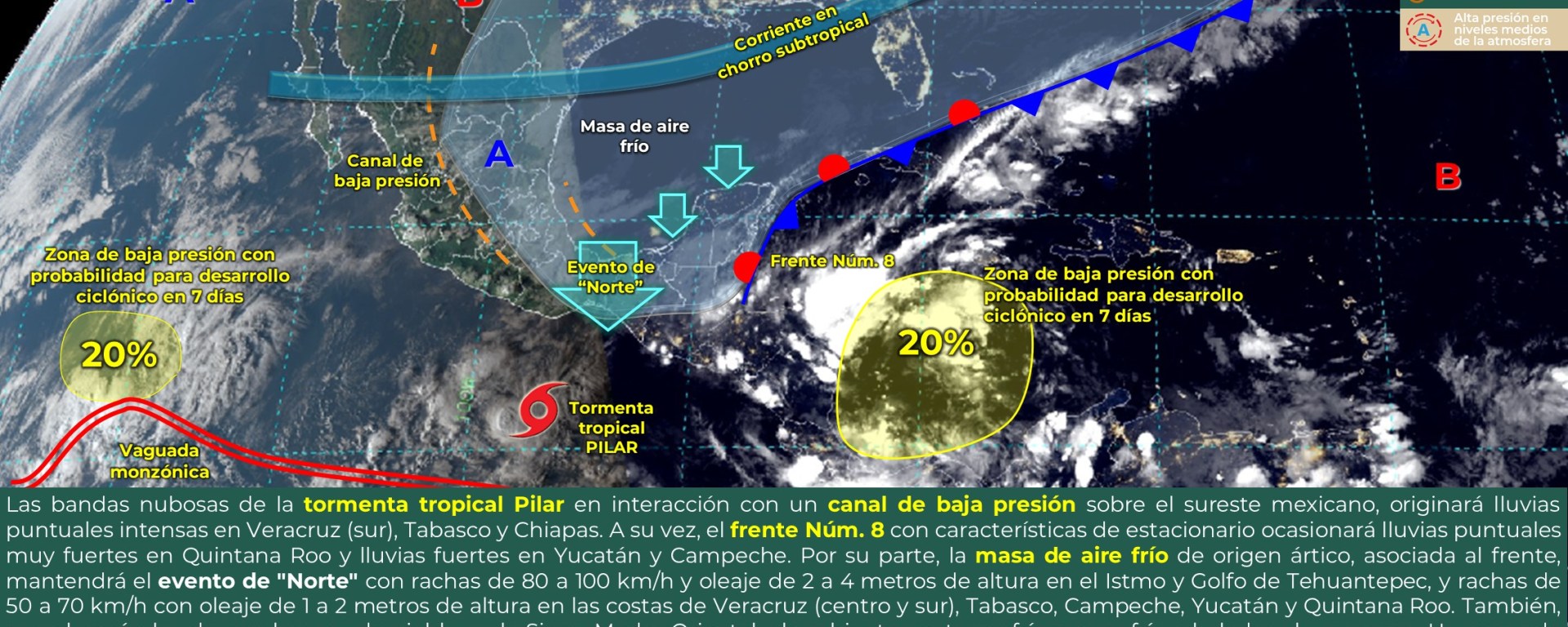 Evento de “Norte” con rachas de 80 a 100 km/h: Istmo de Tehuantepec, y con oleaje de 2 a 4 metros: Golfo de Tehuantepec.