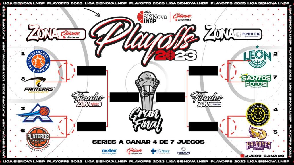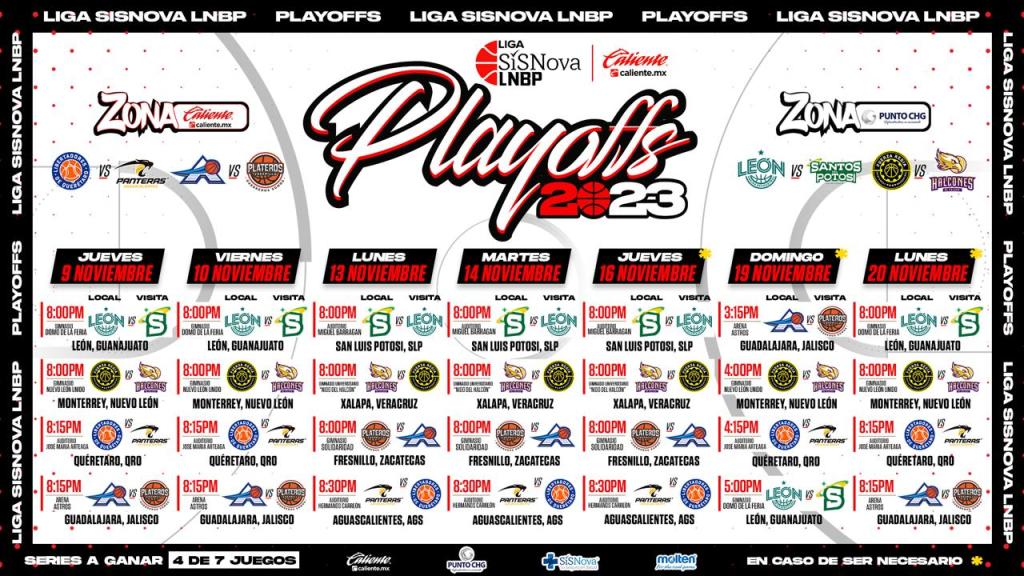 En lo que se refiere a los playoffs, arrancan el próximo jueves 9 de noviembre, cuando los Santos del Potosí visiten a las Abejas de León, mientras que continuará el lunes 13 y el martes 14 de noviembre, cuando reciban al mismo equipo de Guanajuato en el Miguel Barragán a las 20:00 horas; el quinto juego de la serie será en territorio potosino, el jueves 16 de noviembre, en caso de ser necesario el juego sexto y séptimo, estos se llevarán a cabo en el Domo de la Feria de León el 19 de noviembre a las 17:00 horas y el lunes 20 de noviembre a las 20:00.