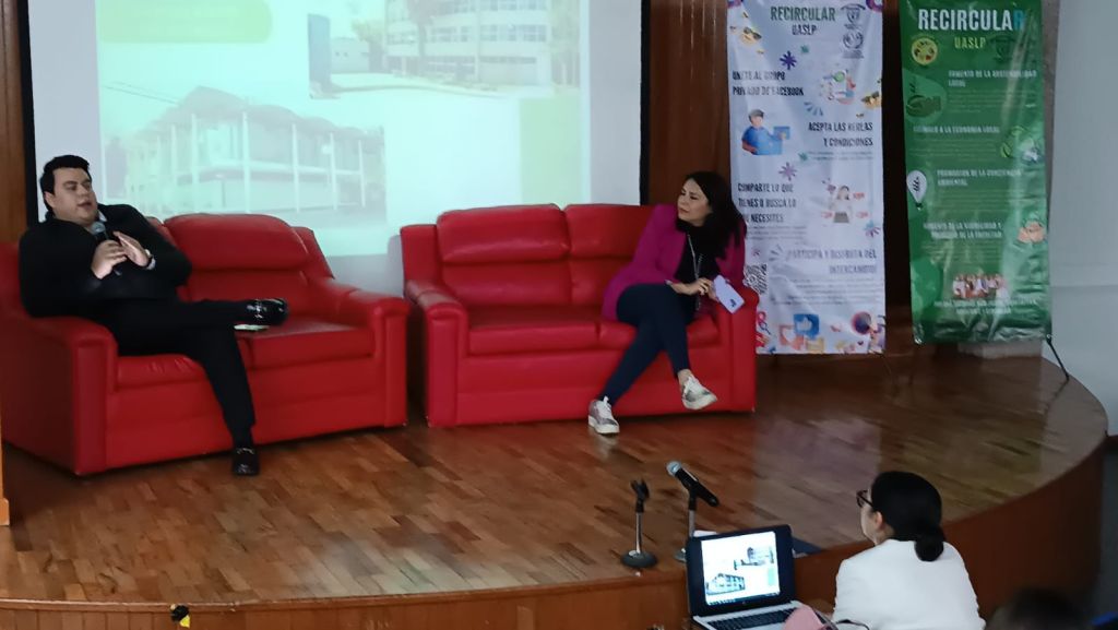 Como parte de las actividades realizadas durante la 1ª. Jornada Sustentable del Campus Centro, organizada por las Facultades de Derecho “Abogado Ponciano Arriaga Leija” y de Contaduría y Administración, se presentó el proyecto “Economía circular en apoyo a la integración comunitaria”, a cargo de Mizpah Gerardo Navarro Ibáñez, egresado de la Facultad de Derecho y estudiante de la Maestría en Ciudades Sostenibles en la Agenda Ambiental de la UASLP.