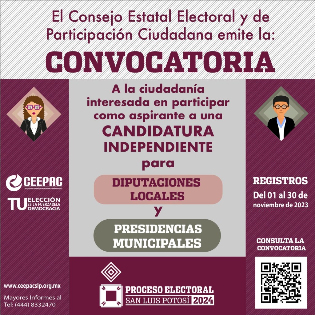 El Consejo Estatal Electoral y de Participación Ciudadana de San Luis Potosí (CEEPAC) reitera que el próximo 30 de noviembre de 2023 es la fecha límite para el registro de aspirantes a candidaturas independientes en el marco del proceso electoral 2024. Esta convocatoria está abierta a la ciudadanía interesada en postularse para cargos de diputaciones y presidencias municipales.