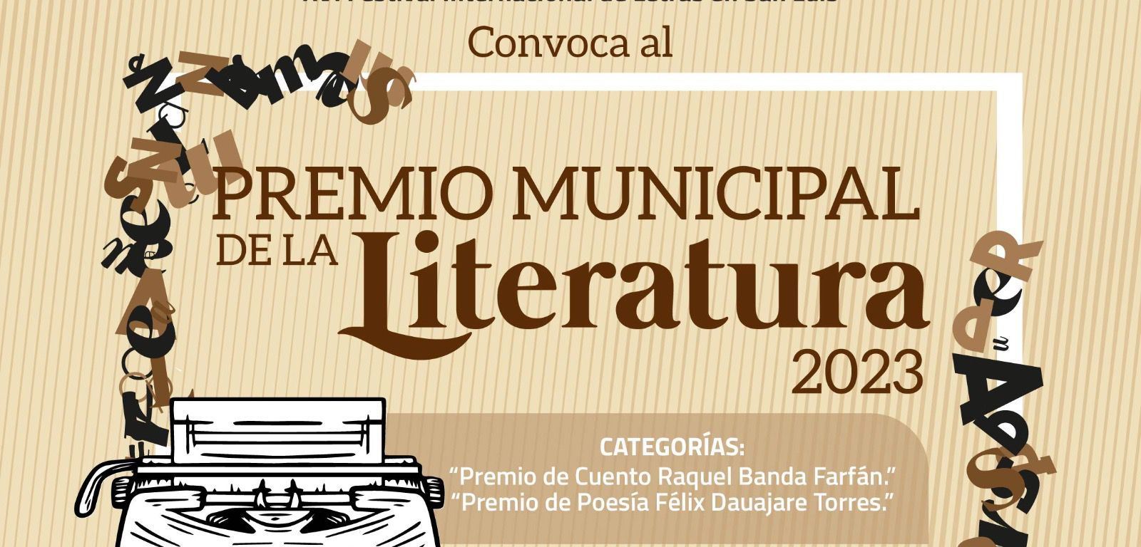 En el marco del XVI Festival Internacional Letras en San Luis, la Dirección de Cultura Municipal y la Comisión de Cultura, Recreación, Deporte y Juventud, convocan a escritoras y escritores potosinos a participar en el Premio Municipal de Literatura 2023, en sus modalidades Raquel Banda Farfán para Cuento y Félix Dauajare Torres para Poesía.