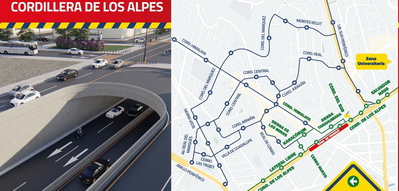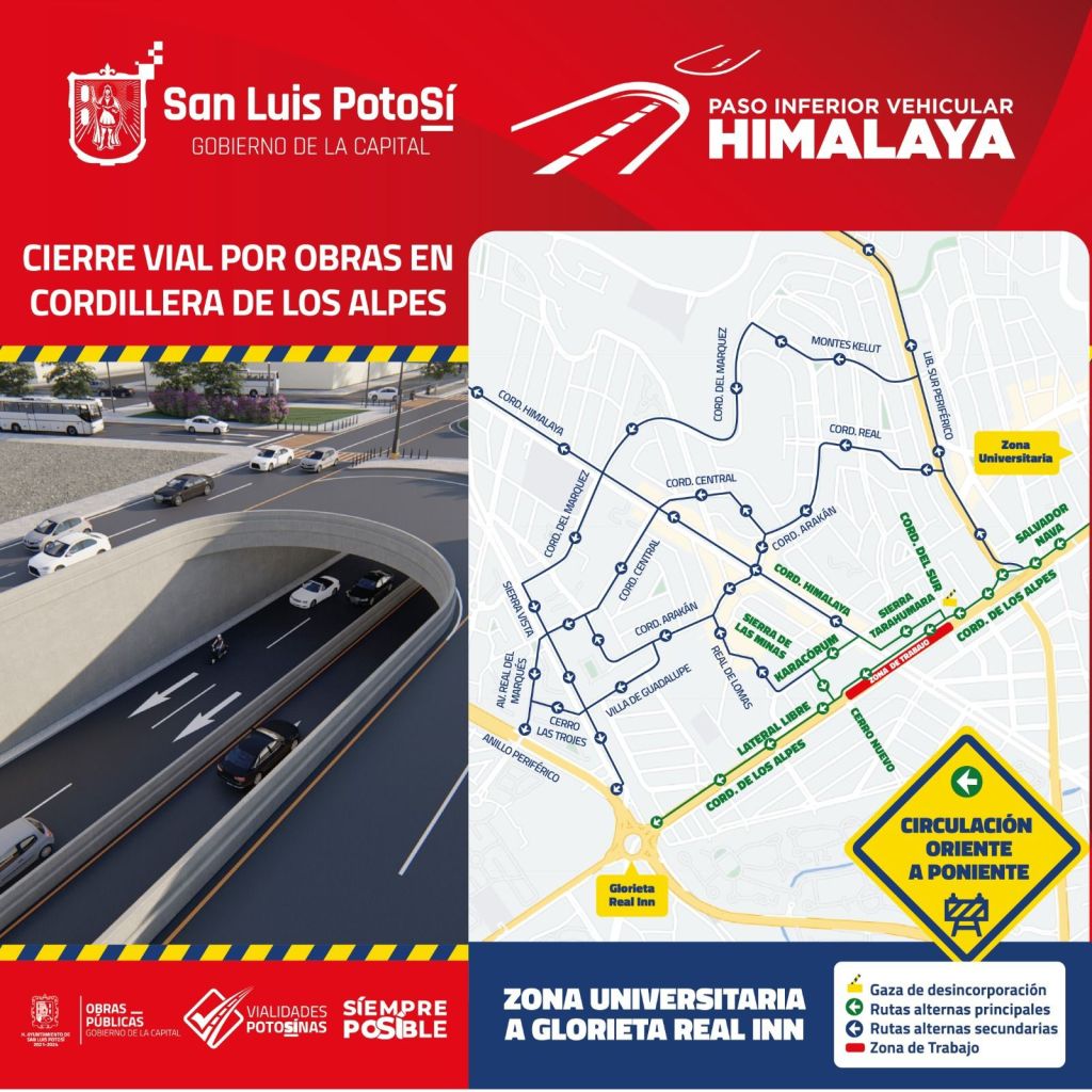 A partir de este martes 21 de noviembre, el Gobierno de la Capital mediante el programa municipal Vialidades Potosinas, inicia los trabajos para la construcción del Paso Inferior Vehicular Himalaya, en el tramo que baja del puente Sierra Leona hasta la altura de la tienda comercial Wal-Mart, por lo que será necesario el cierre a la vialidad en carriles centrales de la avenida Cordillera de Los Alpes en ambos sentidos. Se permitirá circular por carriles laterales de Salvador Nava, además de que se permitirá únicamente la circulación local en calles aledañas.