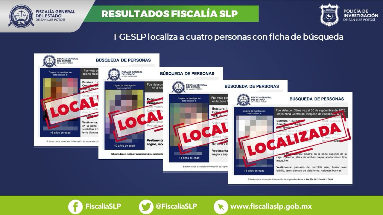 La Fiscalía General del Estado de San Luis Potosí (FGESLP) dio a conocer que consiguió ubicar a cuatro personas en territorio potosino, a través de las acciones en campo de la Policía de Investigación (PDI).