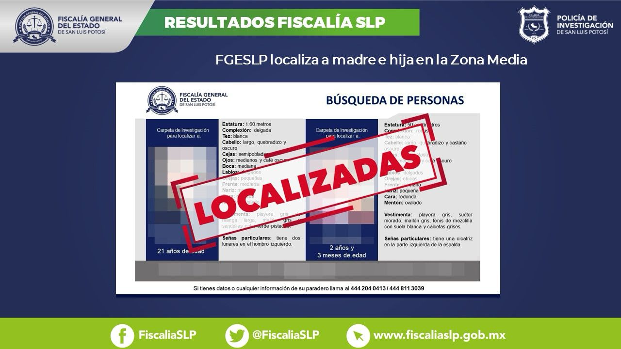 La Fiscalía General del Estado de San Luis Potosí (FGESLP) informó que se ubicó a una madre y a su pequeña hija, quienes el 18