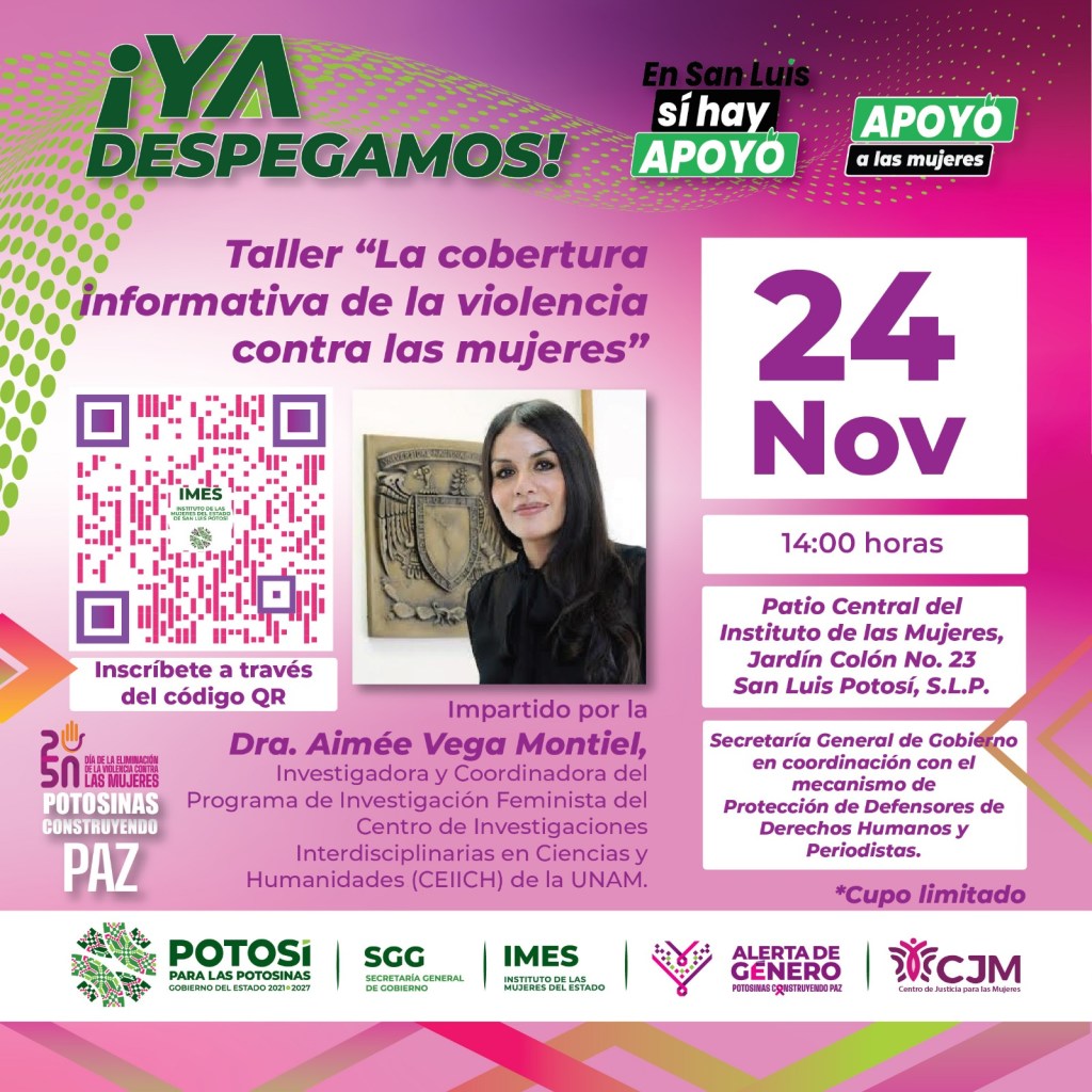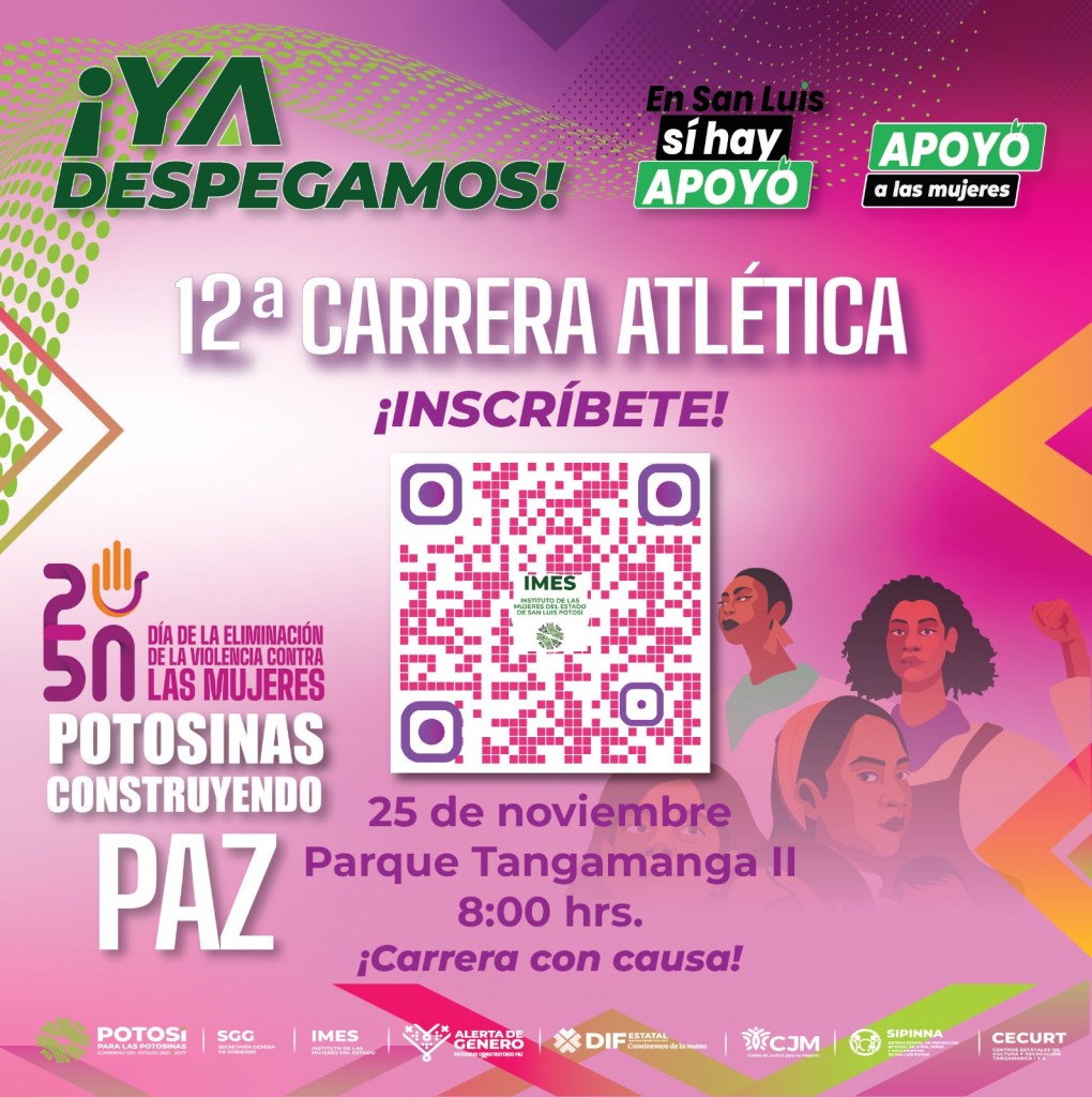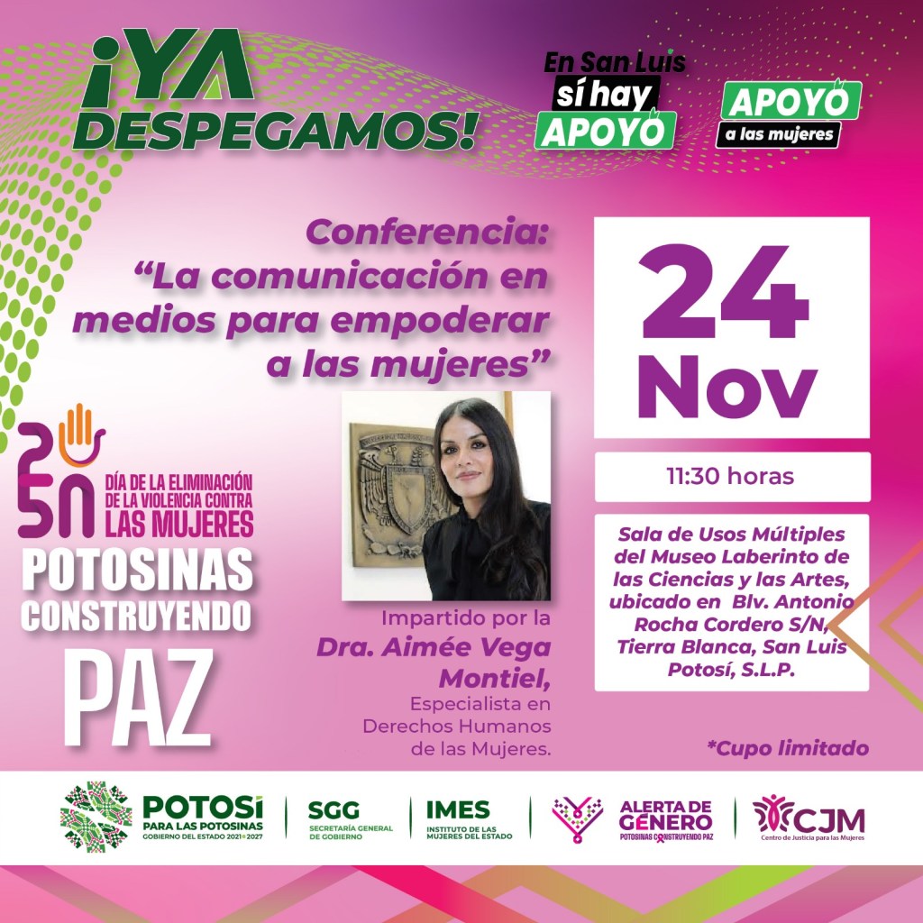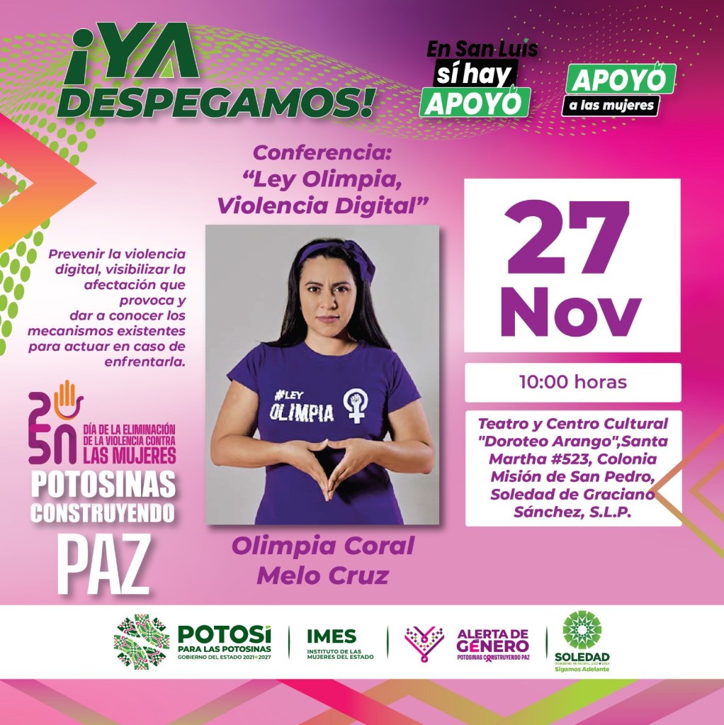Gloria Serrato Sánchez, titular de la dependencia, detalló que, dentro de las actividades, destaca la XII edición de la carrera atlética «Potosinas Construyendo Paz 2023», en el parque Tangamanga II, el sábado 25 de noviembre a las 8:00 horas o la conferencia magistral “Ley Olimpia, Violencia Digital” que impartirá Olimpia Coral Melo el lunes 27 a las 10:00 horas en el teatro Doroteo Arango en Soledad de Graciano Sánchez.