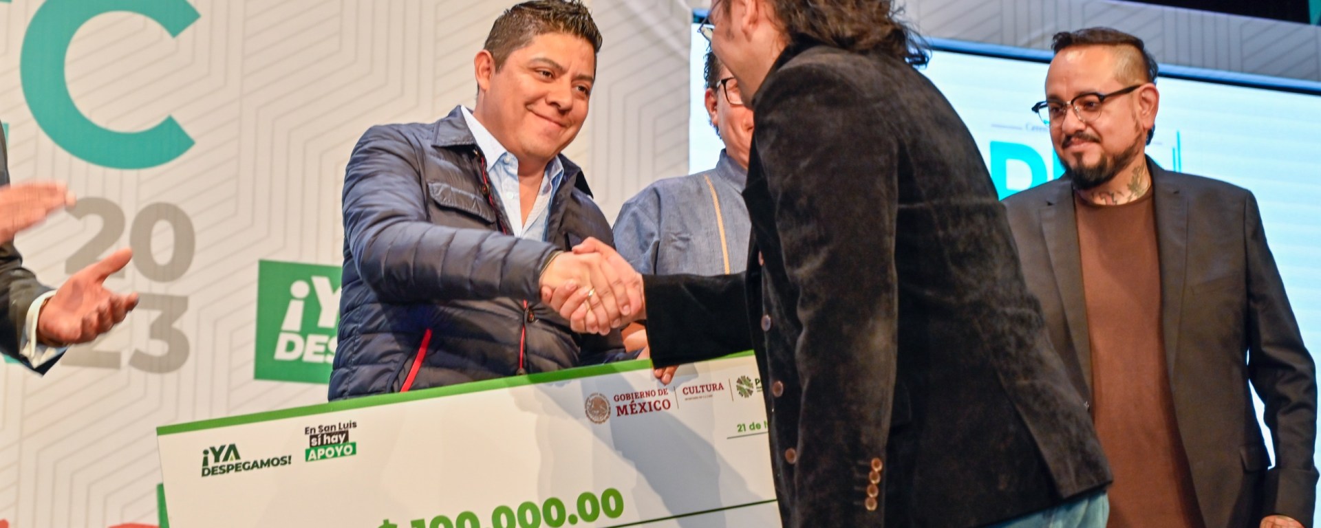 Ricardo Gallardo entregó seis estímulos para Adolescentes Creadores por 30 mil pesos cada uno, 17 para personas jóvenes creadoras con monto de 50 mil pesos; 10 para Creadores con Trayectoria equivalente a 60 mil pesos por persona; tres para desarrollo artístico en territorio nacional o en el extranjero por 50 mil pesos cada uno; tres para publicaciones con un monto individual de 60 mil pesos y cinco para apoyo a producciones escénicas, con cien mil pesos cada una.