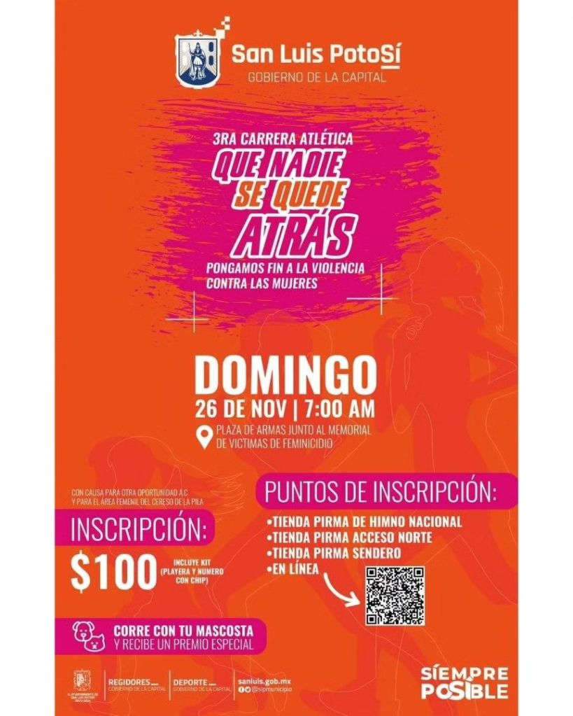 El Ayuntamiento de San Luis Potosí reafirmó que se mantiene abierta la convocatoria para la Carrera Atlética “Que nadie se quede atrás, pongamos fin a la violencia contra las Mujeres”, que se realizará el próximo domingo 26 de noviembre, teniendo como salida y meta, el Memorial para las Víctimas de feminicidio en Plaza de Armas.