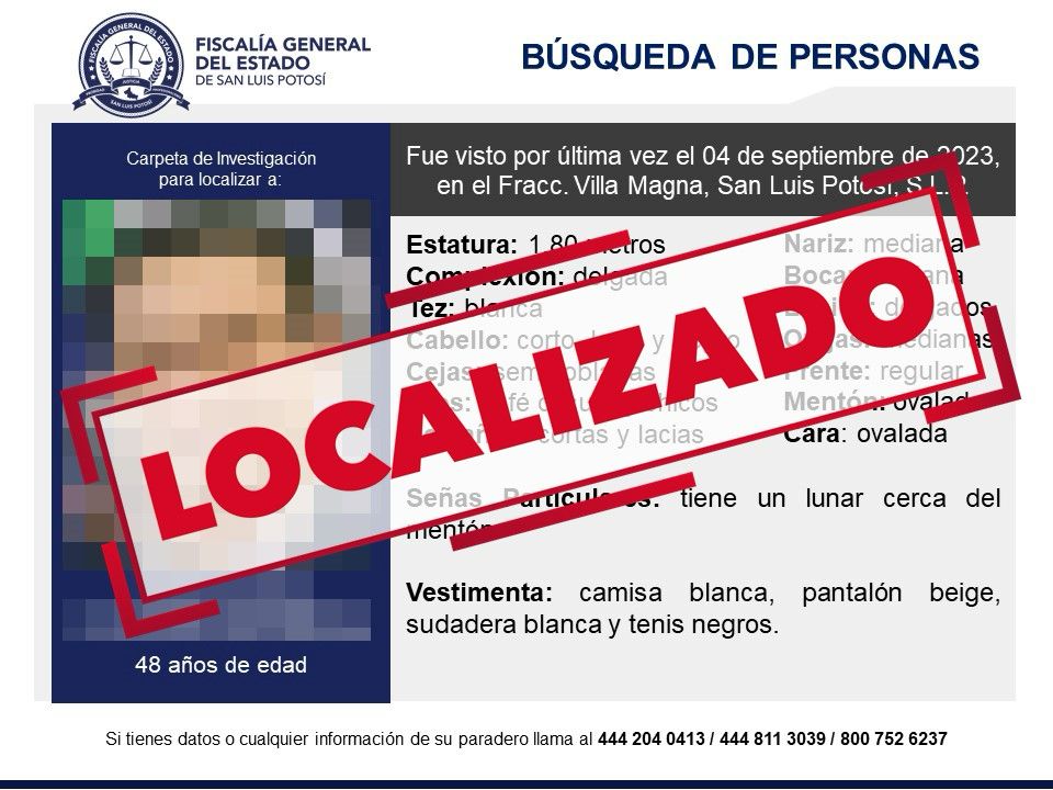 Después de implementar el protocolo homologado de búsqueda, la Fiscalía General del Estado de San Luis Potosí (FGESLP) informó la localización de César, un ejecutivo de 48 años que era buscado en la capital del Estado.