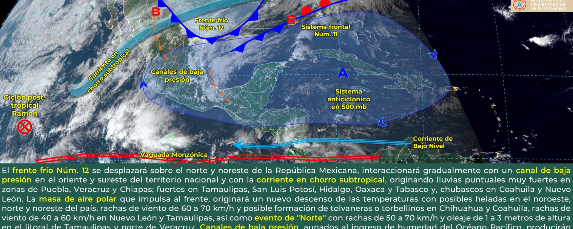 Evento de “Norte” con rachas de viento de 80 a 100 km/h: Istmo de Tehuantepec; y con oleaje de 3 a 5 metros: litoral de Veracruz y Golfo de Tehuantepec; y con rachas de 60 a 80 km/h, posible formación de trombas marinas y oleaje de 2 a 3 metros: litoral de Tamaulipas.