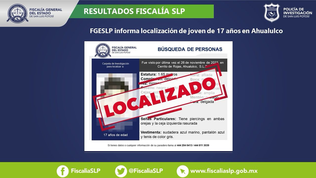 La Fiscalía General del Estado de San Luis Potosí (FGESLP) mediante acciones de la Policía de Investigación (PDI) logró ubicar a Charly, un joven de 17 años de edad que era buscado en el municipio de Ahualulco del Sonido 13.