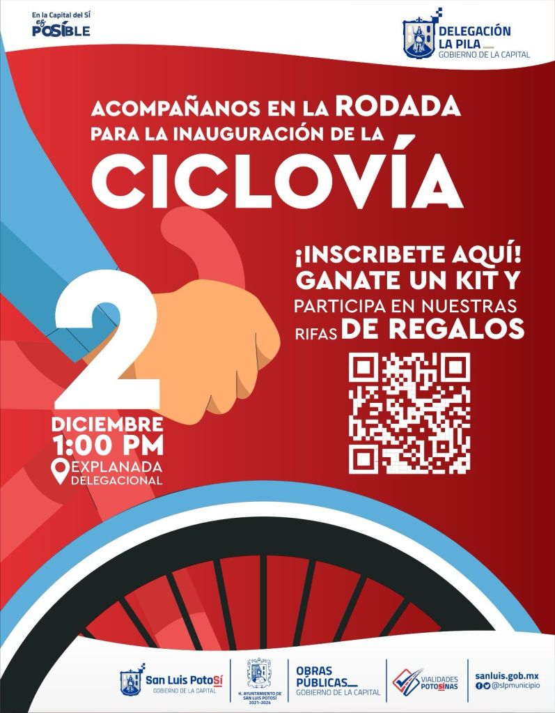 El Gobierno Municipal llevará a cabo la inauguración de una nueva ciclovía en el emblemático acceso principal a la Delegación La Pila. Esta obra es resultado de uno de los programas más exitosos del Ayuntamiento que encabeza el Alcalde Enrique Galindo Ceballos, Vialidades Potosinas, de la Dirección de Obras Públicas.