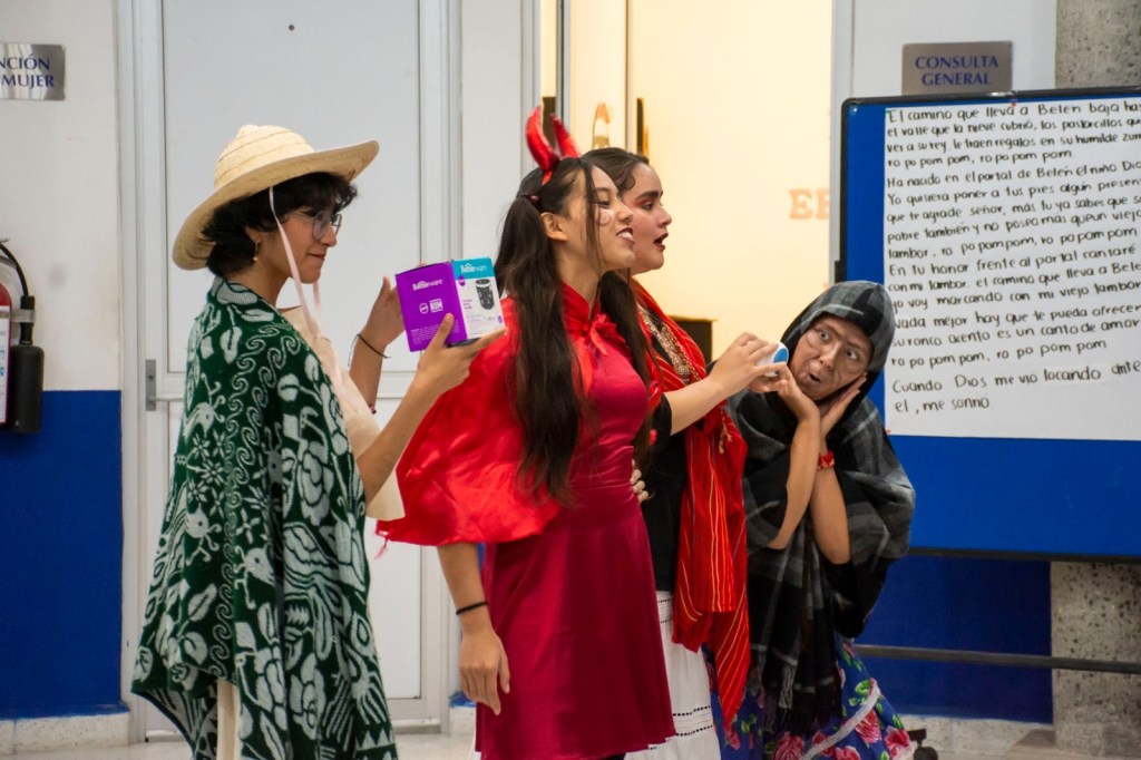 Al inicio del festejo se realizó la tradicional pastorela, en donde por esta ocasión se contó con la participación de alumnas y alumnos del grupo de teatro del Colegio de Bachilleres con la obra “Que se sienta la Navidad”. Posteriormente, el grupo de adultos mayores cantó villancicos al público asistente.