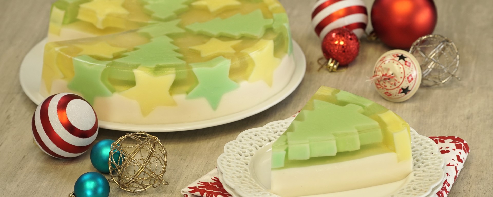 1. 1.- Disuelve el sobre de gelatina de limón en 1 ½ tazas de agua caliente y licúa con ½ lata de Leche Condensada LA LECHERA®. Repite el procedimiento con la gelatina de piña. Vierte las gelatinas en un refractario ligeramente engrasado y refrigera hasta que cuajen. Con un cortador para galletas en forma de pino corta figuras en la gelatina de limón y con uno en forma de estrellas haz lo mismo en la gelatina de piña.