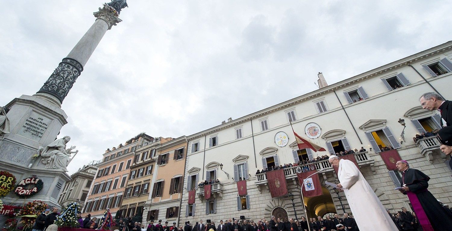 Tras llegar a la Plaza de España, el Obispo de Roma escuchó las letanías de la Virgen María y rezó una oración de agradecimiento y súplica a la Virgen que vela por «las familias», «los lugares de estudio y de trabajo», «las instituciones y oficinas públicas», «los hospitales y las residencias de ancianos», «las cárceles», «los que viven en la calle» y «las parroquias y todas las comunidades» de la Iglesia de Roma. «Gracias por tu presencia discreta y constante, que nos da consuelo y esperanza», dijo el Santo Padre.