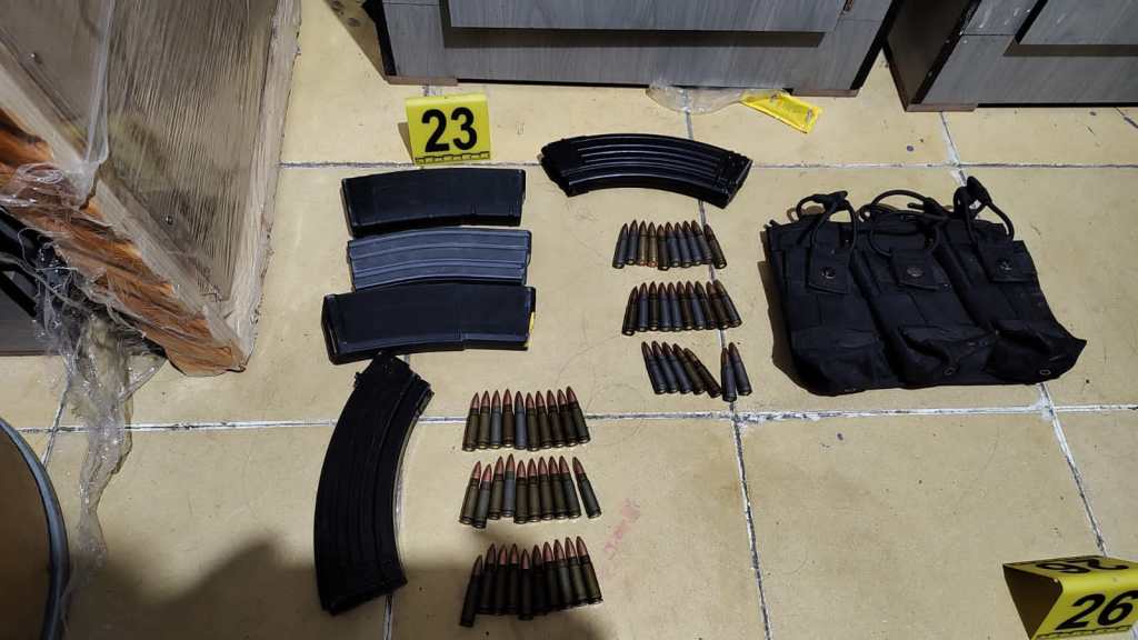 En el primer inmueble aseguraron dos armas largas de uso exclusivo de las Fuerzas Armadas; un arma corta del uso exclusivo; 10 casquillos percutidos calibre .223 mm; cuatro casquillos percutidos calibre .9 mm; un arma de fuego larga, tipo escopeta calibre 9 x 19 con un cargador desabastecido; un arma de fuego larga tipo carabina calibre .223 con cargador abastecido con cinco cartuchos útiles; cuatro radios comunicadores y tres bolsas de material sintético con sustancia granulada cristalina.