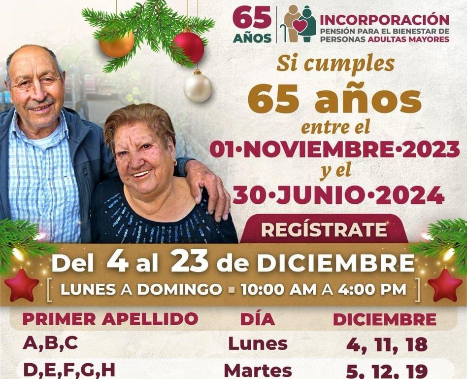 La secretaria de Bienestar, Ariadna Montiel Reyes, recordó que este 23 de diciembre vence el plazo para registrarse a la Pensión para el Bienestar de las Personas Adultas Mayores para quienes cumplen 65 años entre el 1° de noviembre de 2023 y el 30 de junio de 2024.