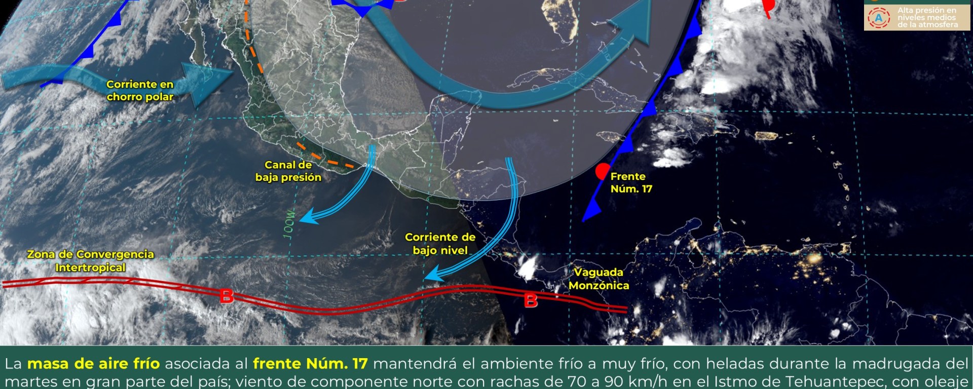 Viento de componente norte con rachas de 70 a 90 km/h: Istmo de Tehuantepec, con oleaje de 2 a 4 metros de altura: Golfo de Tehuantepec, y con rachas de 40 a 60 km/h y oleaje de 1 a 3 metros de altura: costas de Yucatán y Quintana Roo. Rachas de viento de 40 a 60 km/h con posibles tolvaneras: Coahuila, Nuevo León y Tamaulipas.