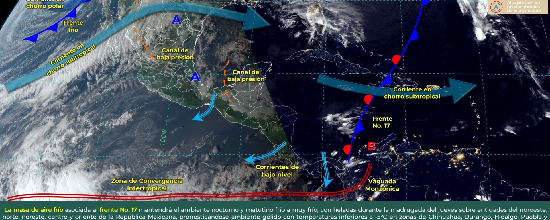 Temperaturas mínimas de -5 a 0 °C con heladas para la madrugada del jueves: sierras de Baja California, Sonora, Coahuila, Nuevo León, San Luis Potosí, Zacatecas, Guanajuato, Querétaro, Estado de México, Tlaxcala y Oaxaca.