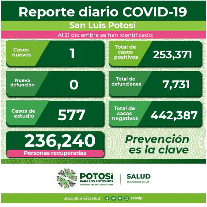 En SLP se da a conocer 1 nuevo contagio por Covid, ya suman 253 mil 371.