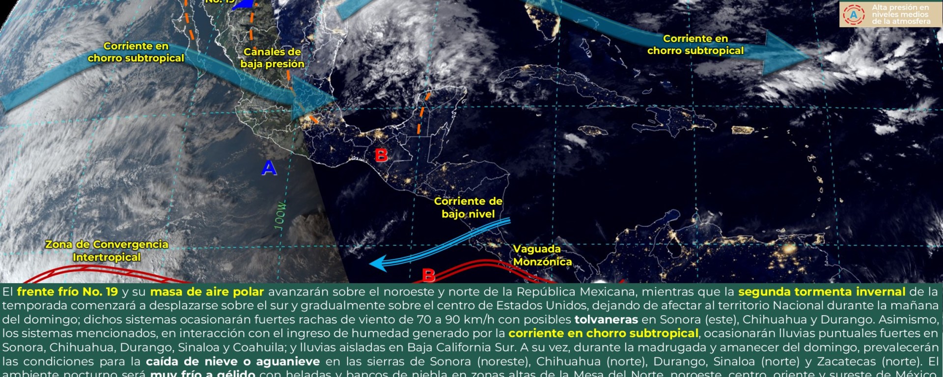 Rachas de viento de 40 a 60 km/h con posibles tolvaneras: Chihuahua, Coahuila, Nuevo León, Tamaulipas, San Luis Potosí, Zacatecas, Aguascalientes, Nayarit, Jalisco, Michoacán, Guanajuato, Querétaro, Hidalgo, Puebla, Tlaxcala, Estado de México, Ciudad de México, Guerrero, Oaxaca y Chiapas.