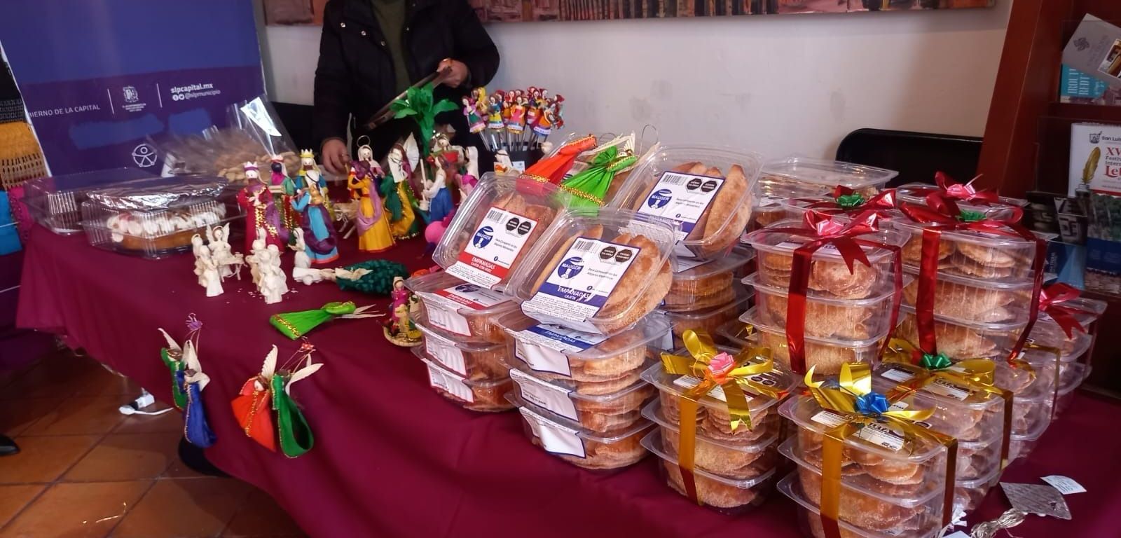 Asimismo, con el objetivo de apoyar la promoción, consumo y colocación en el mercado de productos y marcas potosinas, tuvo lugar el “Bazar Artesanal Navideño” con la participación de diez expositores como chocolates, café, rompope, pan, artesanías en hojas de maíz, dulces y frutos secos, rebozos, decoraciones, repostería, entre otros.