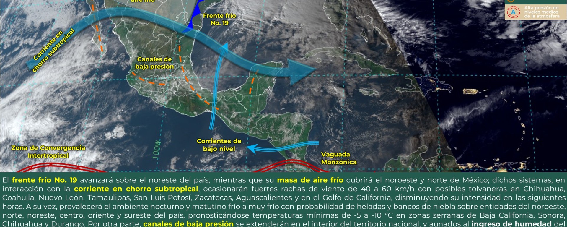 Rachas de viento de 40 a 60 km/h con posibles tolvaneras: Baja California Sur, Baja California, Golfo de California, Sonora (costa), Sinaloa (costa), Chihuahua, Durango, Zacatecas, San Luis Potosí, Aguascalientes, Jalisco, Michoacán, Guanajuato, Querétaro, Hidalgo, Estado de México, Ciudad de México, Tlaxcala, Puebla, Guerrero y Oaxaca.