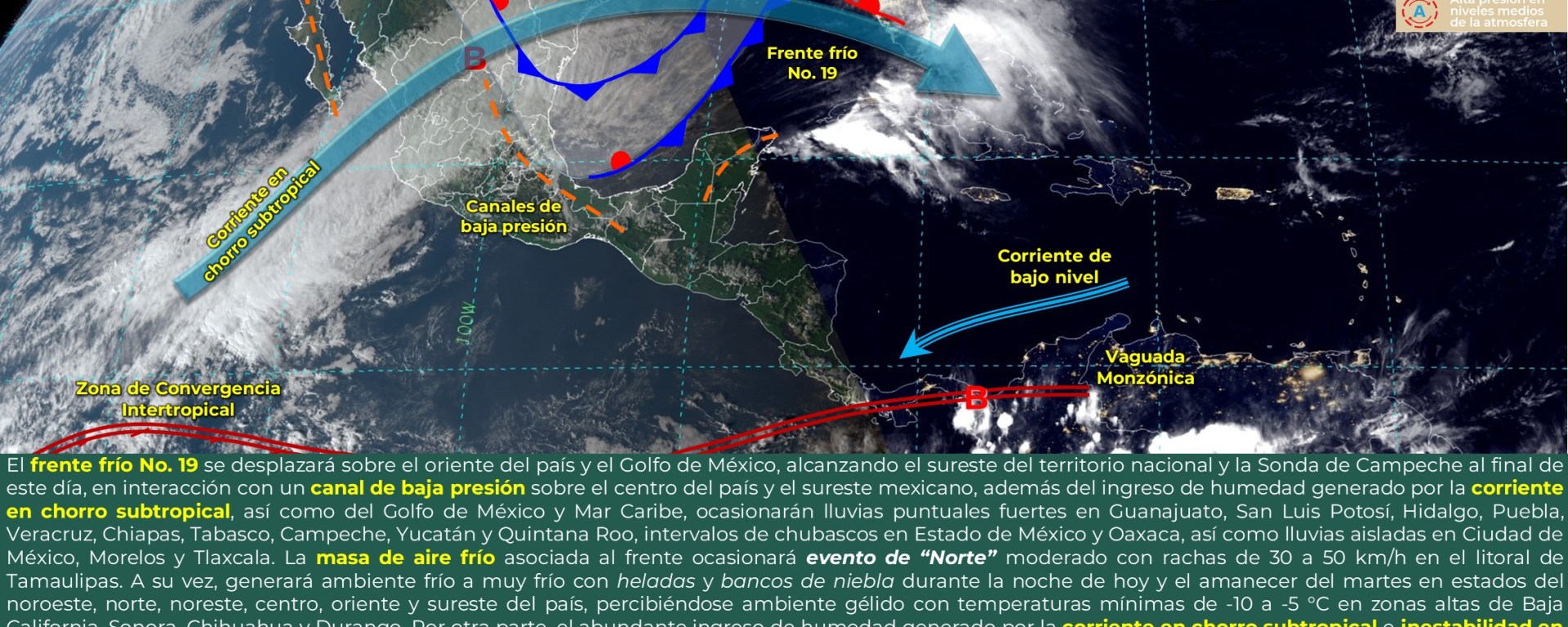 Probabilidad de caída de nieve o aguanieve durante la noche de este día y el amanecer del miércoles: cimas montañosas con altitudes superiores a los 4,200 msnm del centro y oriente del país (Nevado de Toluca, Popocatépetl, Iztaccíhuatl, Sierra Negra, Pico de Orizaba y Cofre de Perote).