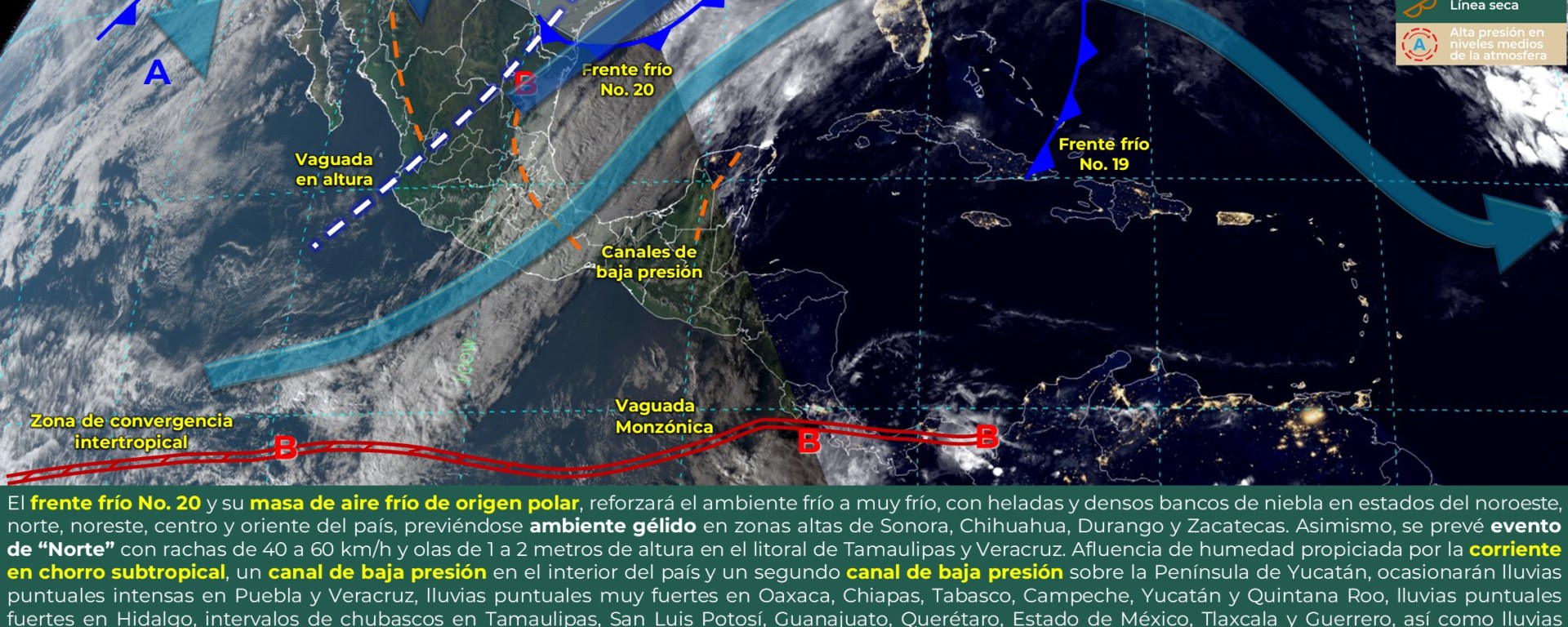 Evento de “Norte” con rachas de 60 a 70 km/h y oleaje de 1 a 3 metros de altura: centro y sur de Veracruz, Istmo y Golfo de Tehuantepec; con rachas de 30 a 50 km/h y oleaje de 1 a 2 metros de altura: litorales de Tamaulipas, norte de Veracruz, Tabasco y la Península de Yucatán.