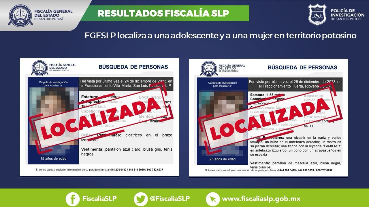 Por una parte, Cristina, con quien se tuvo contacto por última vez el 24 de diciembre de 2023 en la capital potosina; fue localizada en compañía de su pareja sentimental, en buen estado de salud y sin haber sido víctima de algún delito.