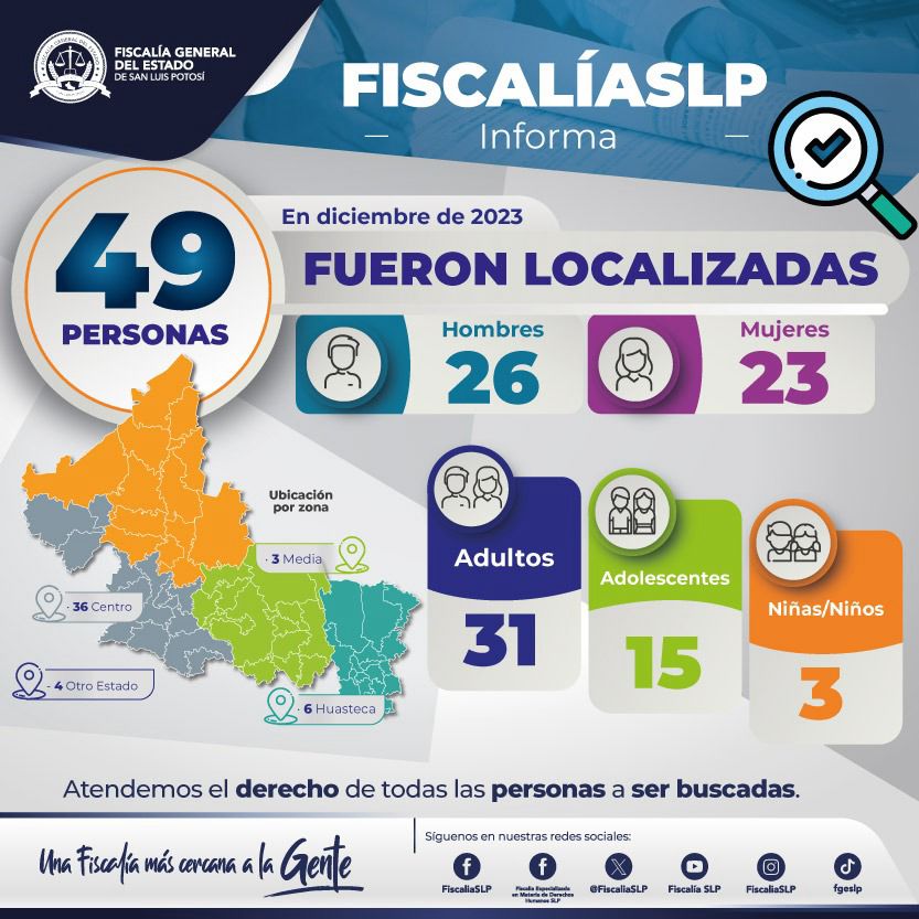 En diciembre de 2023, la Fiscalía General del Estado de San Luis Potosí (FGESLP) localizó a 49 personas en la Entidad potosina, a través de las acciones que implementó la Dirección General de Métodos de Investigación (DGMI), operando en las seis delegaciones adscritas.
