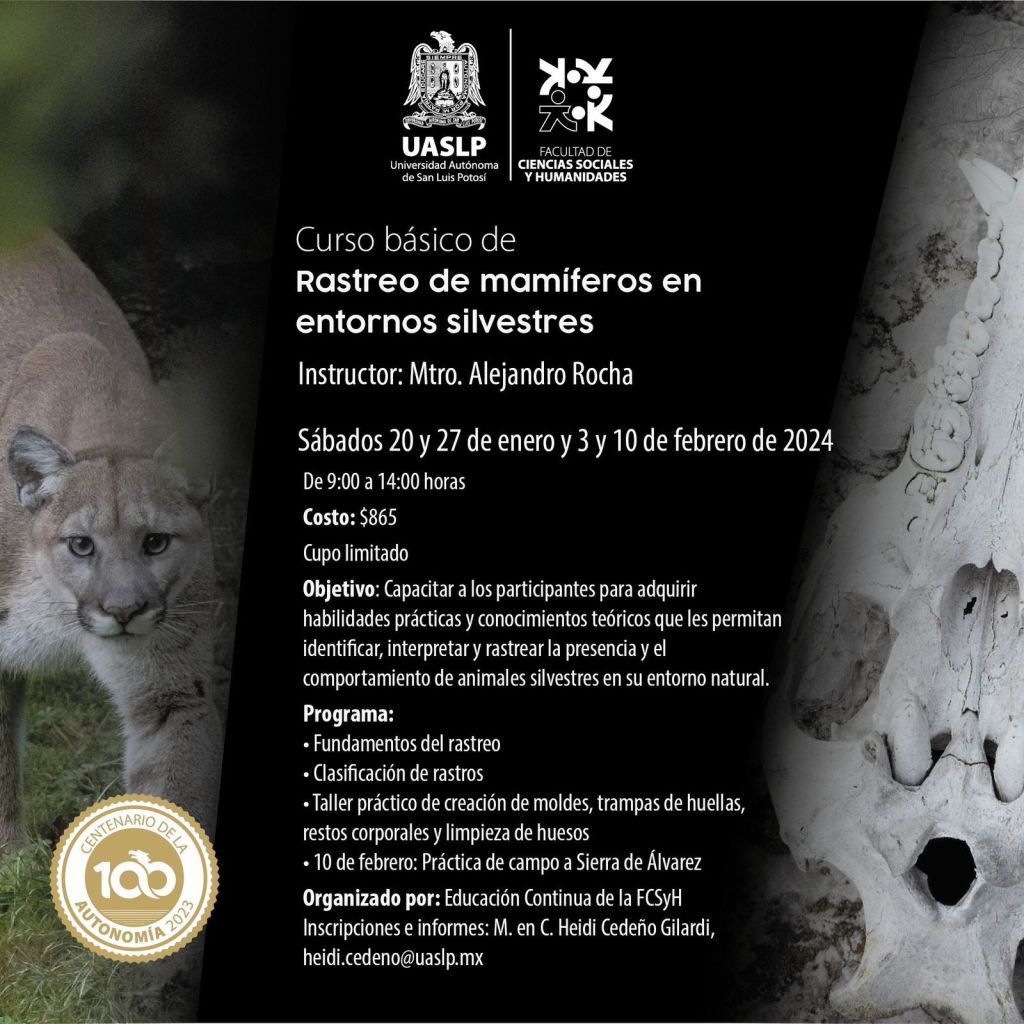 La Facultad de Ciencias Sociales y Humanidades de la UASLP a través de su área de educación continua, invita a todos los egresados y estudiantes de las carreras que tienen que ver con el cuidado del medio ambiente y el turismo ecológico, a inscribirse en el curso: Rastreo de Mamíferos en Entornos Silvestres, que tendrá lugar los sábados 20 y 27 de enero y 3 y 10 de febrero del 2024, en las instalaciones de la entidad, en el área teórica, de 9:00 a 14:00 horas.