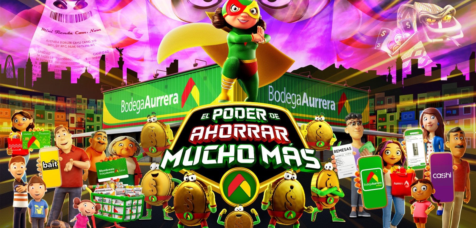 Ella, junto son sus aliados de la Liga del Ahorro, que son los servicios y beneficios que brinda Bodega Aurrera a sus clientes, como las Morrallitas, Cashi, Bait, y las Marcas Propias, entre otras, derrotarán a los villanos de la economía que amenazan con dejar sin sus ahorros a una nueva Era de Ahorradores, quienes son las nuevas generaciones a las que la marca quiere llegar a través de esta renovación de acciones actuales y modernas.