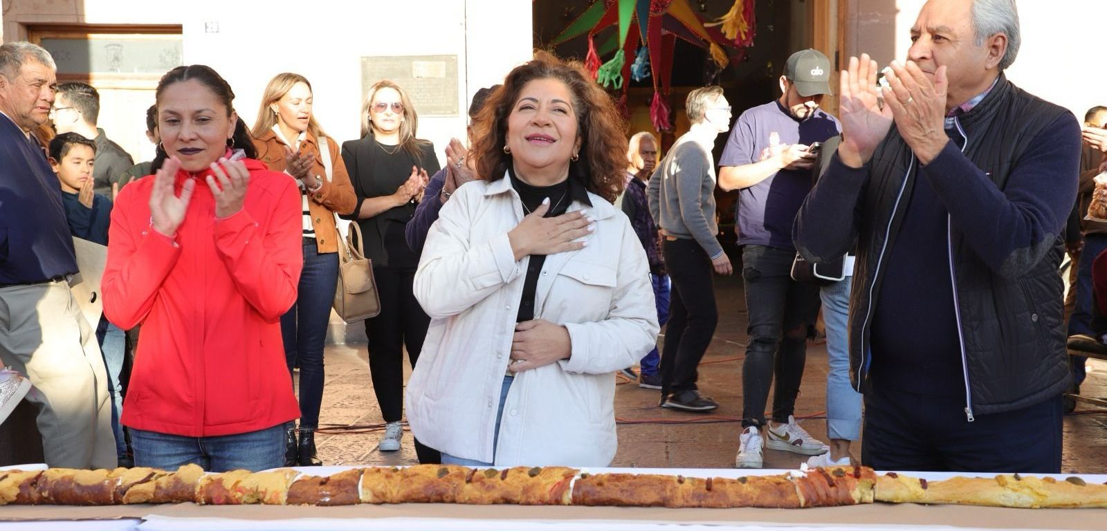La Presidenta del Sistema Municipal DIF, Estela Arriaga Márquez, en representación del Alcalde Capitalino, Enrique Galindo Ceballos, compartió con las familias potosinas la monumental Rosca de Reyes de 280 metros de largo. La convivencia tuvo lugar en la Plaza de Armas, frente a Palacio Municipal, donde se distribuyeron 600 Niños Dios en este pan tradicional que trae alegría a niñas, niños, adultos y personas adultas mayores.