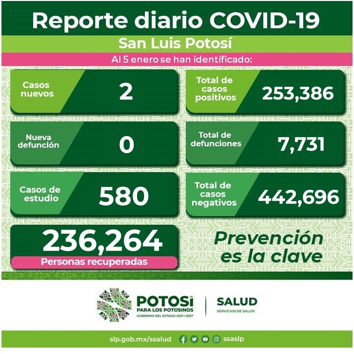 Los nuevos contagios fueron detectados en la Jurisdicción Sanitaria I, ambos en la capital potosina; en personas residentes de otra Entidad, así como en las Jurisdicciones Sanitarias II de Matehuala, III de Villa de Pozos, IV de Rioverde, V de Ciudad Valles, VI de Tamazunchale y VII de Tancanhuitz, no se reportan nuevos casos.